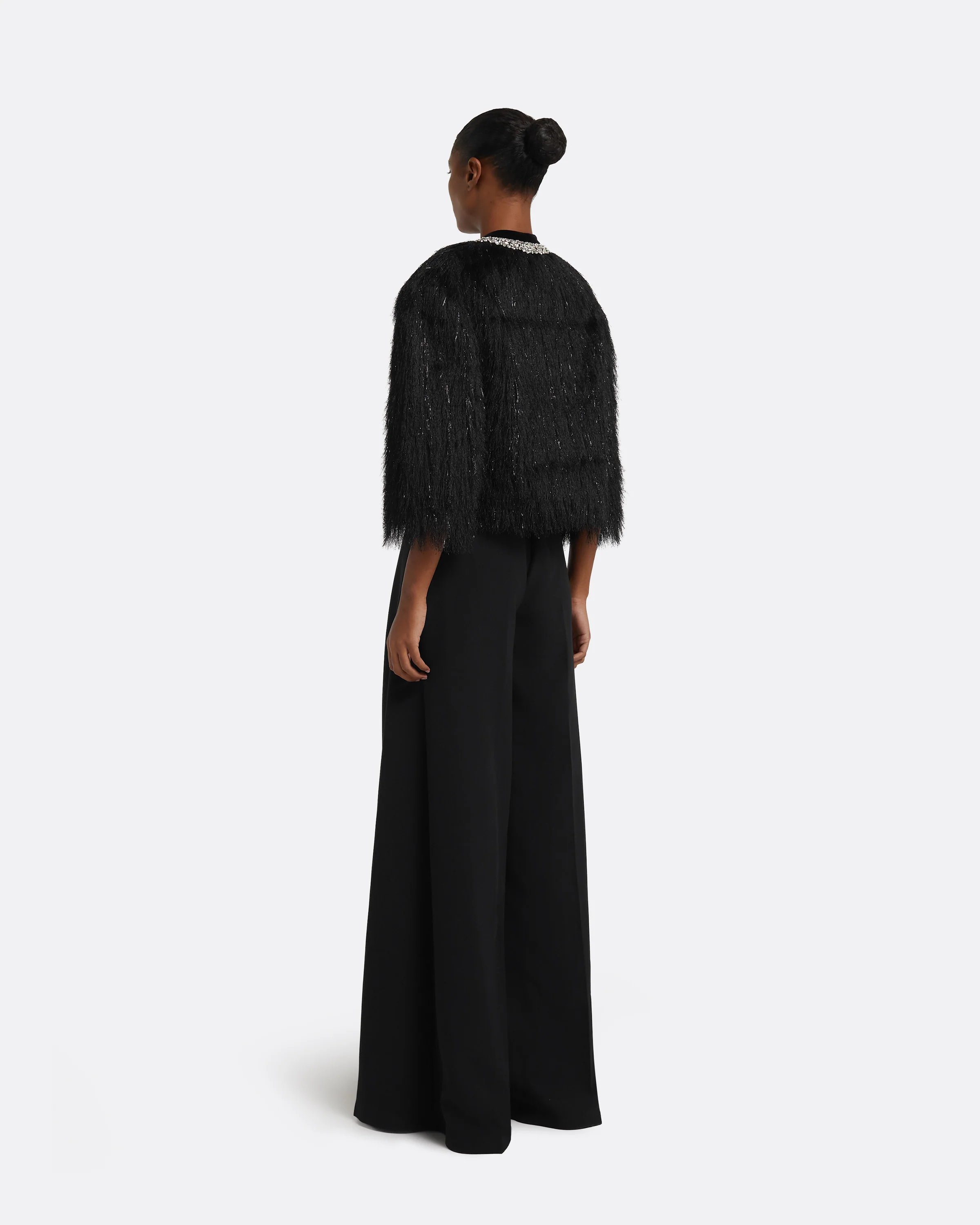 From the Resort ’26 collection, the Ivy jacket introduces an expressive contrast of texture and composure. Its tactile surface shimmers softly under light, while a crystal-trimmed collar adds refined structure to its voluminous, cropped shape.